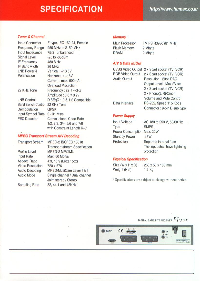 CARACTERISTIQUETECHNIQUE DU RECEPTEUR HUMAX F1-FOX (page1)(page2)