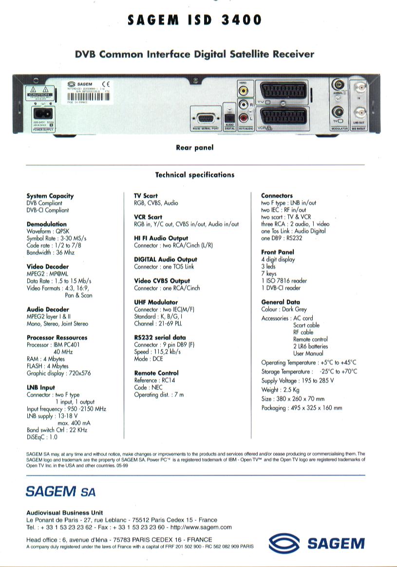 CARACTERISTIQUE TECHNIQUE DU RECEPTEUR SAGEM ISD 3400 (page1)(page2)
